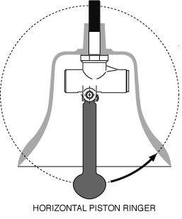 These are pneumatic ringers engineered for specifically for compressed air, not steam. There have been two basic configurations used, both being available in single-action or double-action styles (single-action ringers depend on the air being utilized only on the power stroke, relying on the momentum of the returning clapper for the return to battery- double-action ringers use the air to actually assist the return part of the operation).