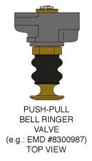 The push-pull type of bell operating valve comes in many varieties, but they all consist of a knob/cartridge assembly screwed into a cast iron body of some sort (usually a single cartridge body, but occasionally they are found in bodies accepting up to four different valve cartridges). The inlet and outlet on the body may be oriented top and bottom or both to the rear, and the cartridges may be manual, 3-way (both manual or automatic), and so on. One of the most common types is the simple manual operating valve (EMD #8300987 VALVE .. Bell operating - Push pull type - GWS-616-1A-BH) having a brass knob stamped BELL. It pulls out to operate, and pushes in to stop. A rubber dust boot extends between the front of the cartridge and the knob. |