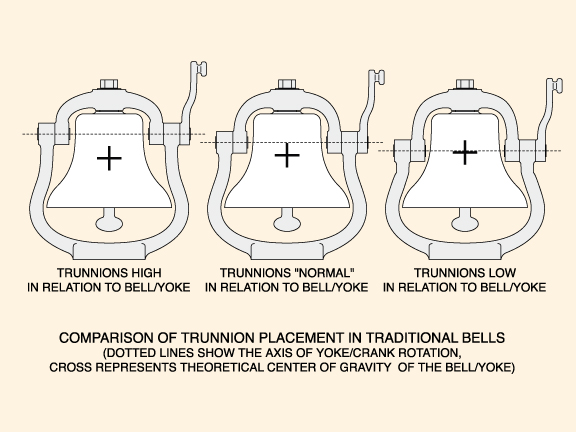 Generally speaking, the higher the trunnions are in relation to the center of gravity of the bell and yoke assembly, the more effort it will take to begin swinging the bell. Conversely, the lower the trunnions in relation to the bell/yoke CG, the less energy it will take to begin the swinging motion. Unfortunately, as the axis of the trunnions is further lowered towards the CG of the bell/yoke assembly, said assembly tends toward static balance; if this is actually achieved, the yoke/bell is then inherently unstable and is as likely to be upside down in the stand as it is to be right side up.